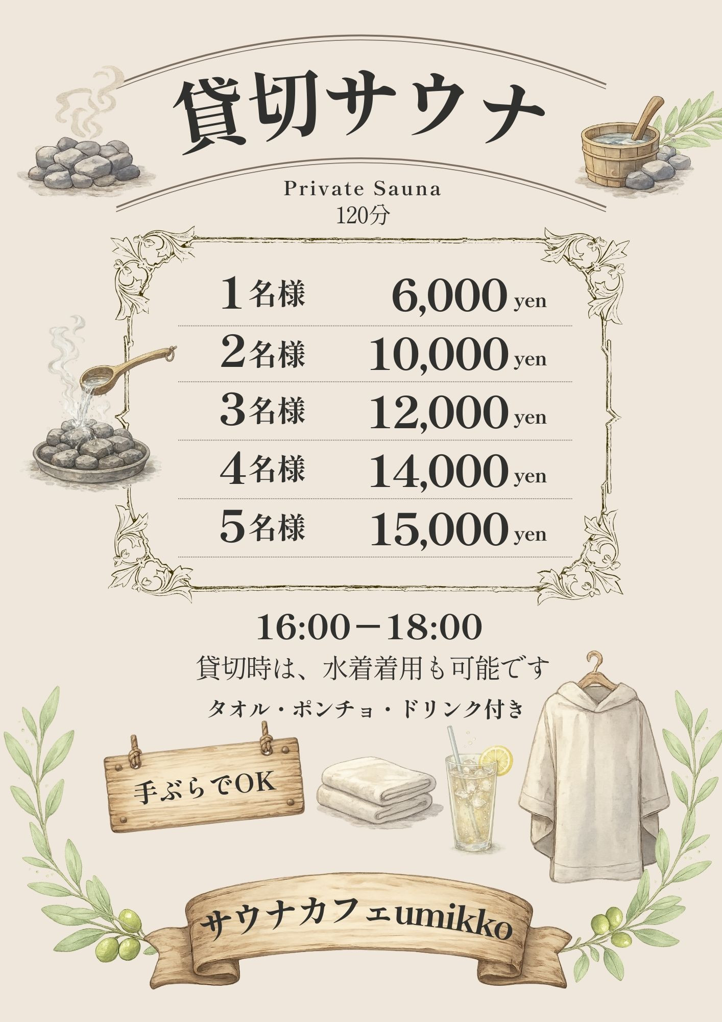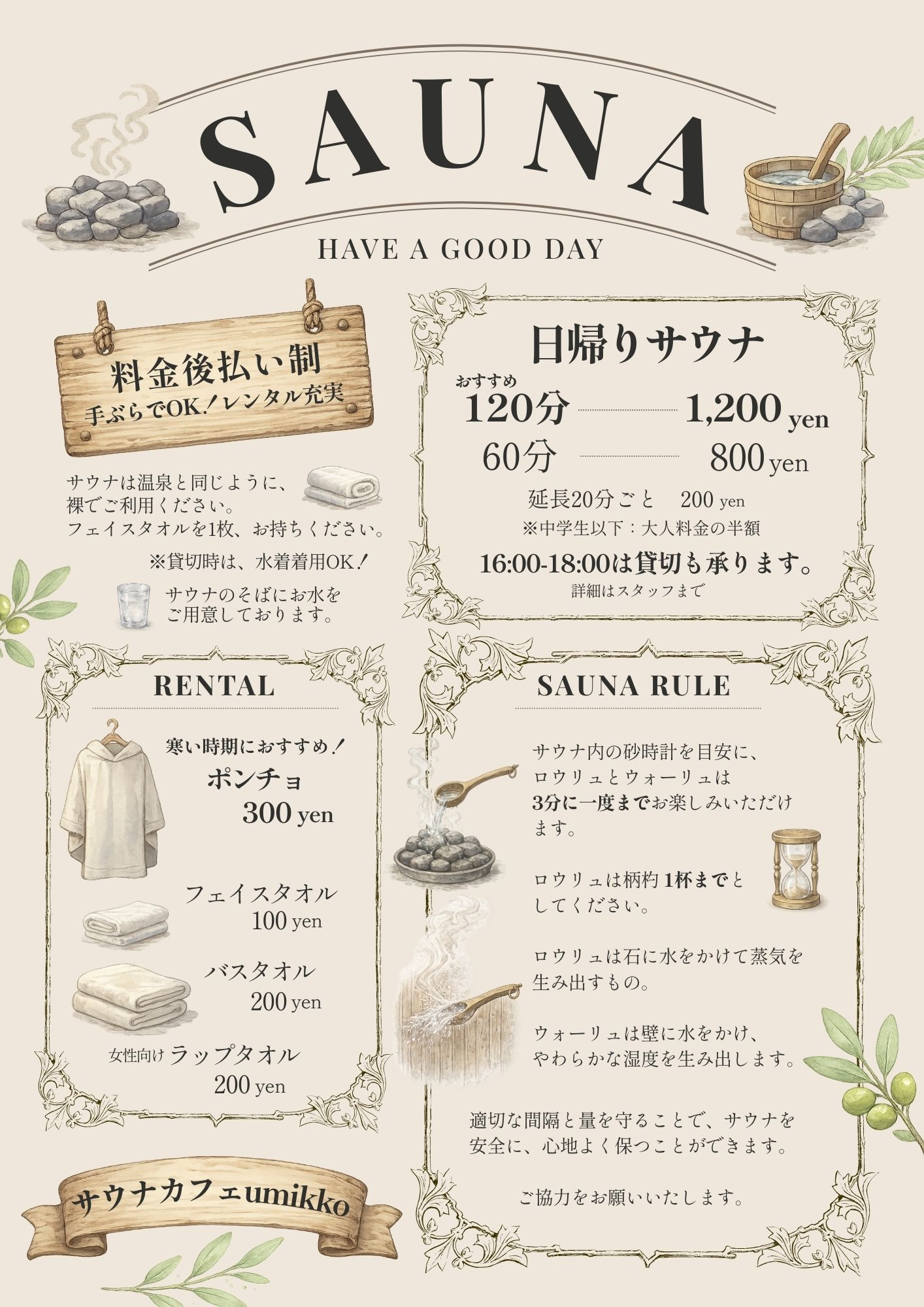 ・サウナカフェumikko(日帰りサウナ・カフェ)