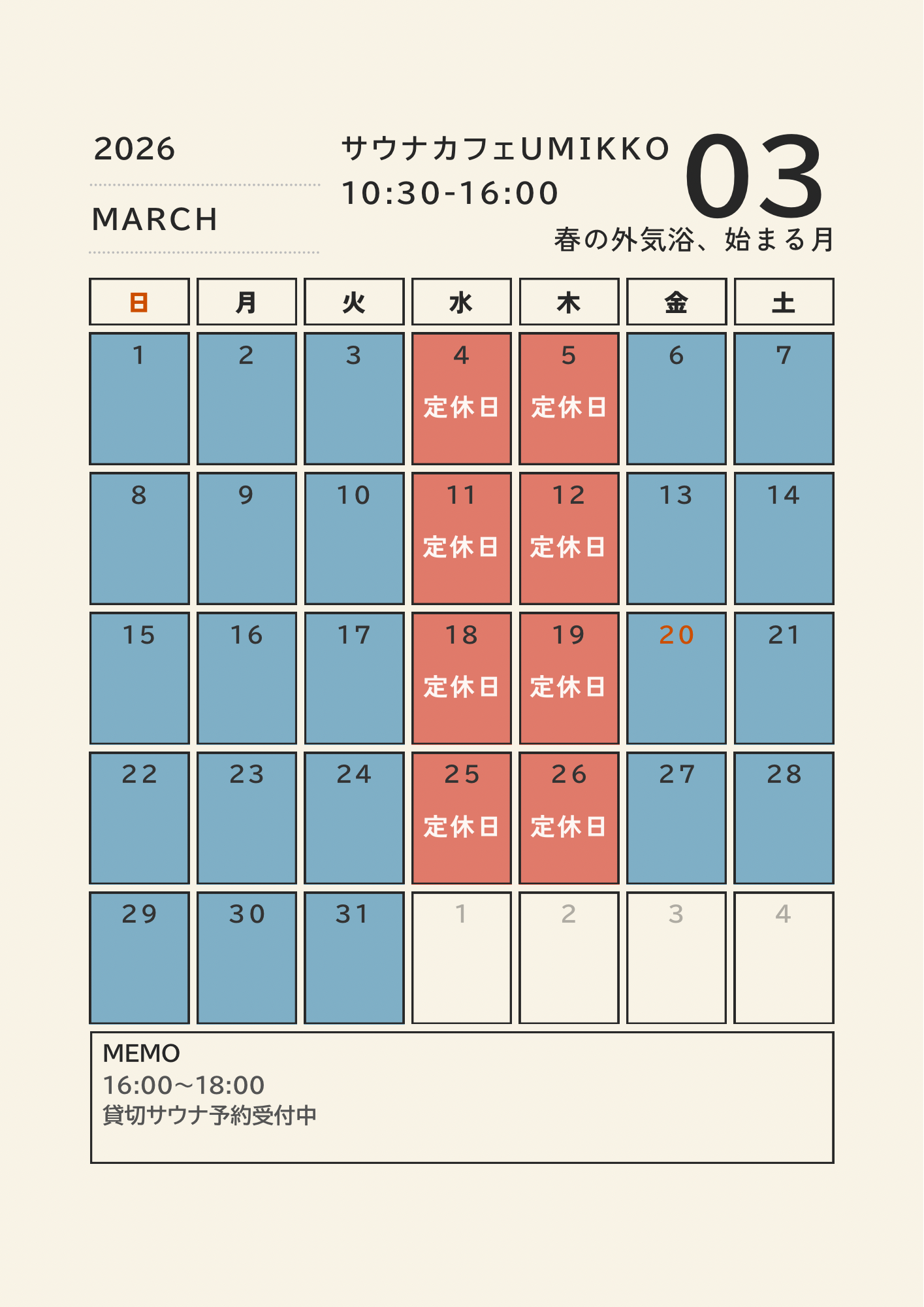冬季期間:水曜・木曜定休日