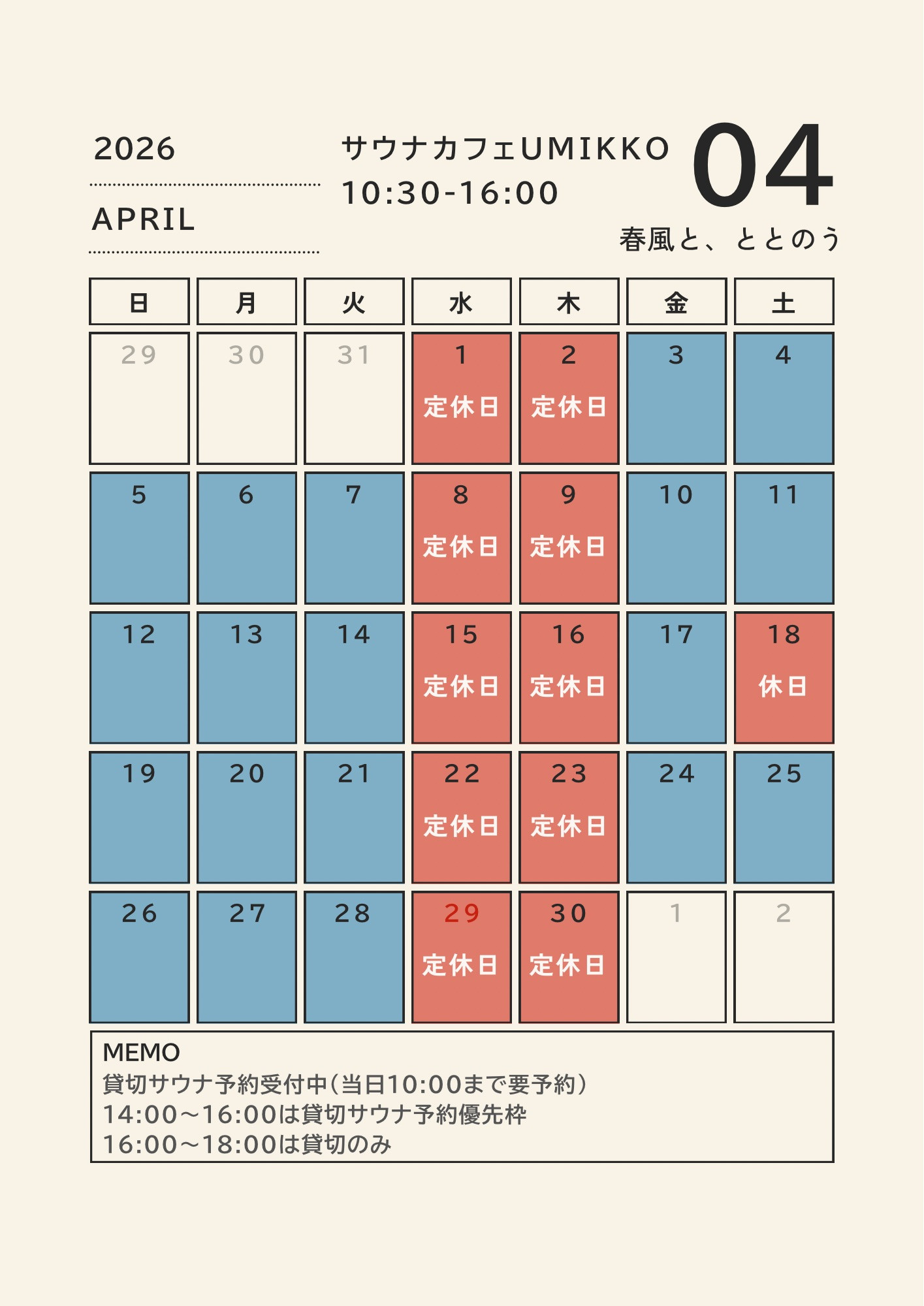 14:00–16:00は貸切サウナ予約優先となる場合がございます。